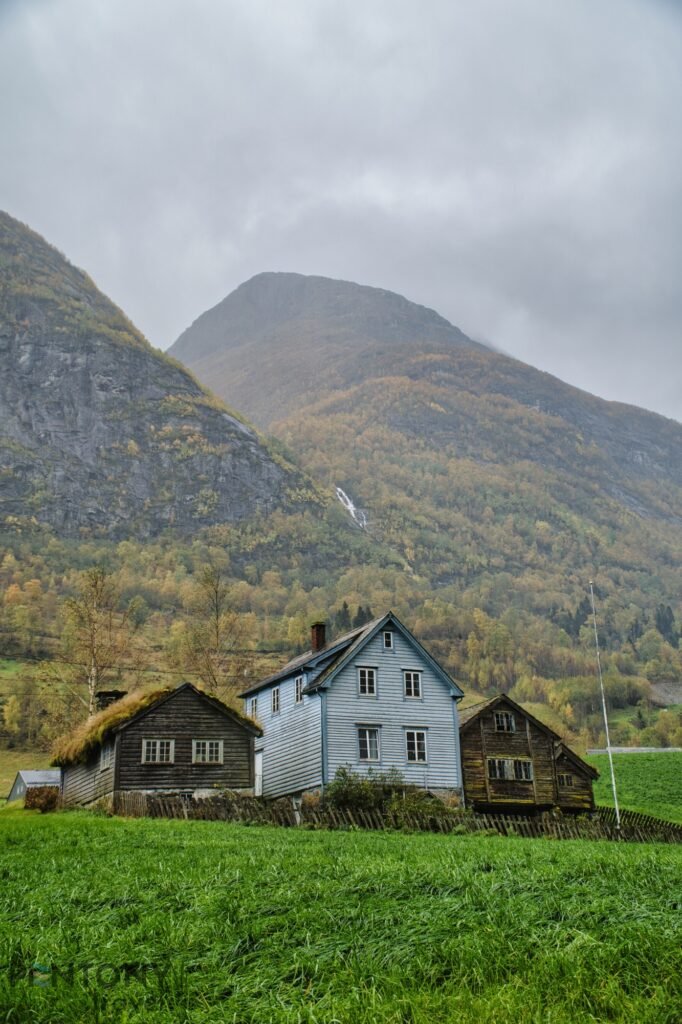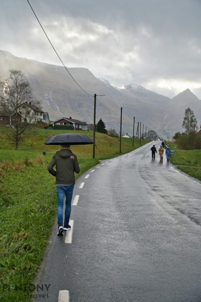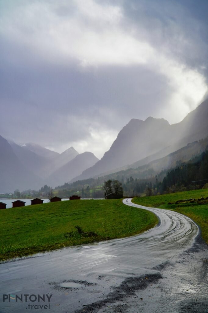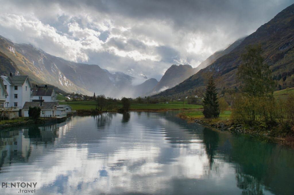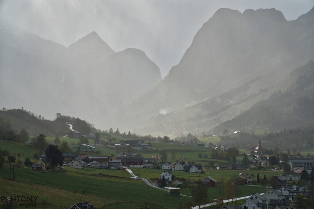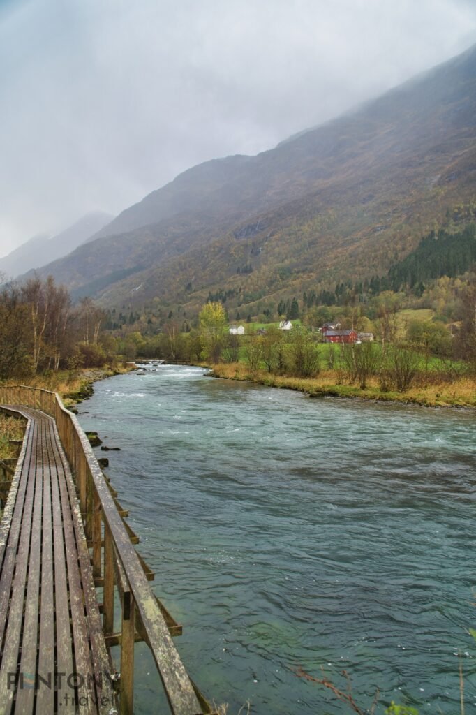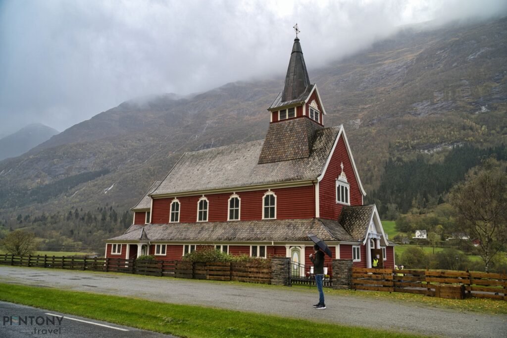 We carried on up the valley, passing a number of the village’s houses and the main school before the town disappears and a picturesque valleys landscape appears. Every 100-or-so metres there’s something new to see, be it the red-panelled Olden Church or one of many traditional farmhouses.
